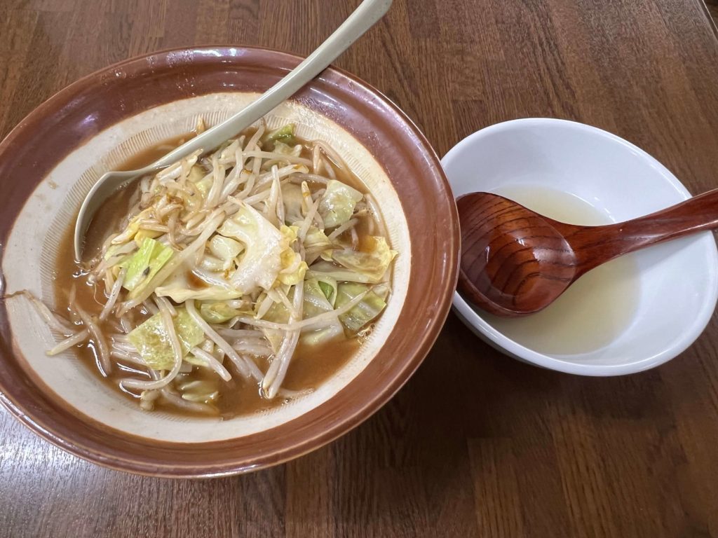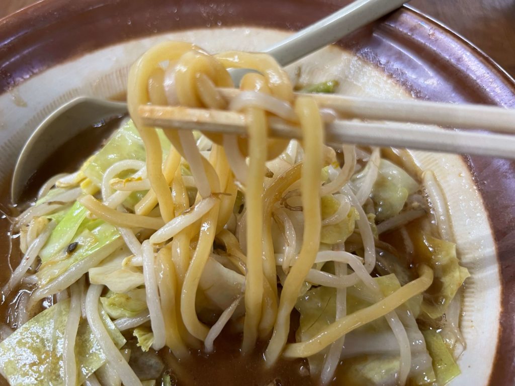 味噌がしっかり絡む極太のモチモチ麺と、たっぷり盛られた野菜が特徴的で、食べ応え満点です。
